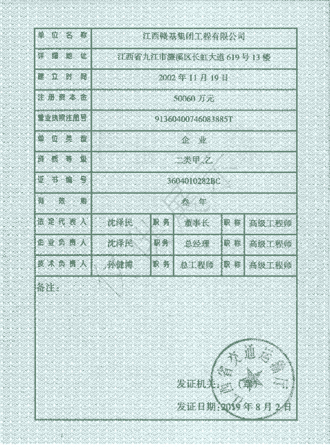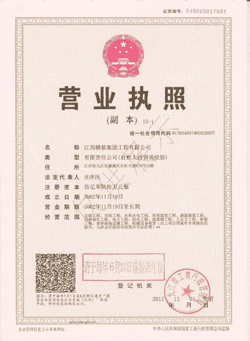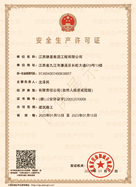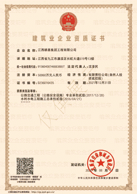 江西贛基集團工程有限公司是國家壹級施工總承包企業(yè),具有公路工程、市政公用工程、房屋建筑工程總承包壹級資質(zhì);公路路基、路面專業(yè)壹級;水利水電工程、電力工程、城市園林綠化、公路養(yǎng)護工程貳級資質(zhì)。